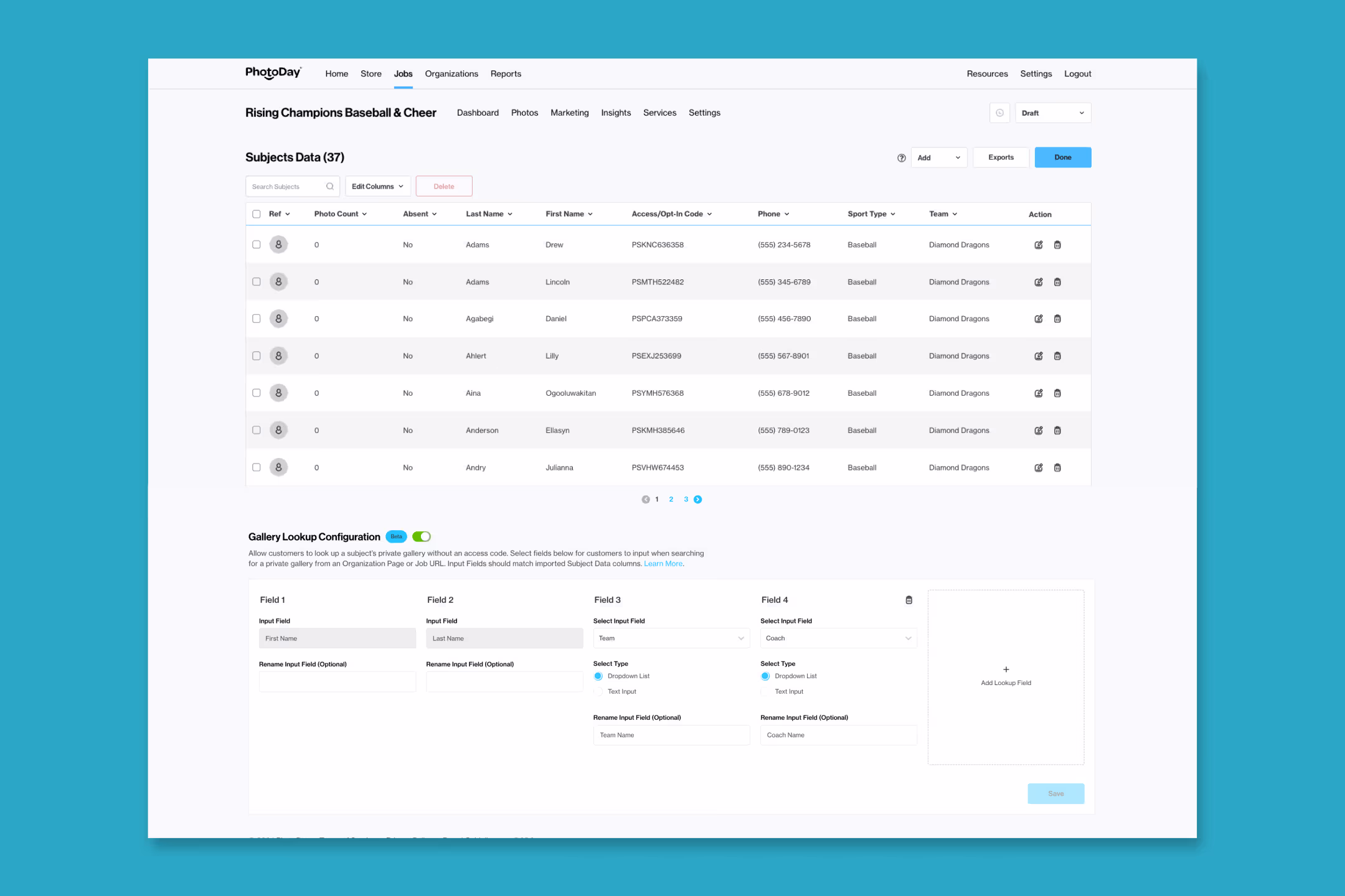 Garrett is a busy volume photographer who wants to try PhotoDay’s private galleries for an extra level of security. But what happens if the school or league doesn’t want to provide email addresses? Now he can provide them with a single Organization Page link to distribute to everyone. This link can remain the same year after year, and jobs can be added to and removed from the Organization Page as needed. With Gallery Lookup, Garrett can rest easy that every parent can find their child’s gallery—even if they never received a unique access code beforehand.