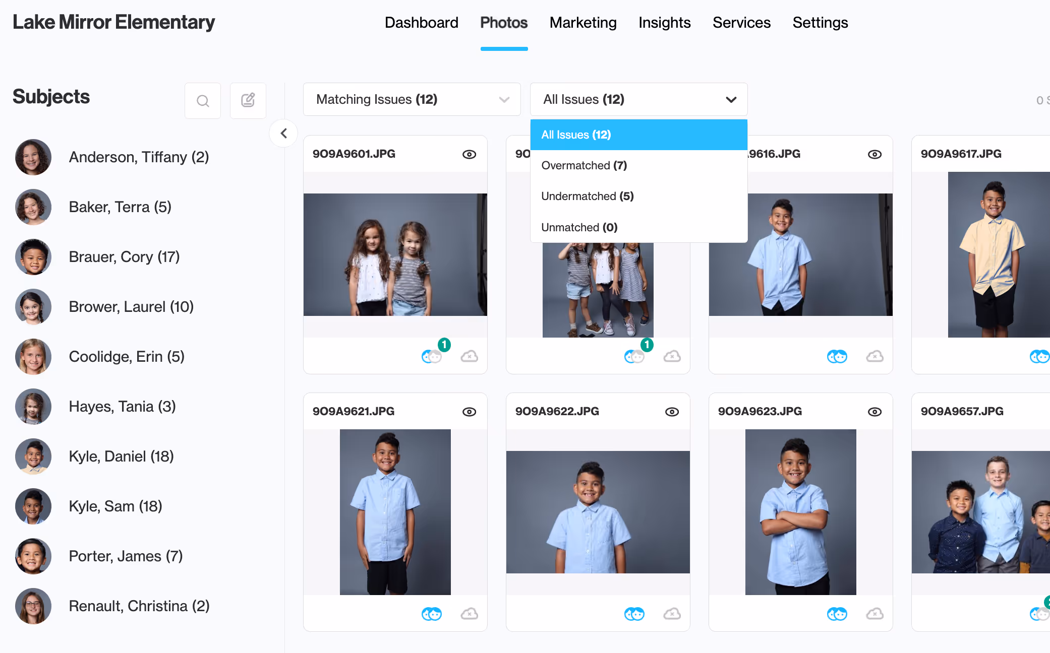 - Unmatched: Any images that have not been matched to any subject/gallery. Match to a subject's gallery to resolve.