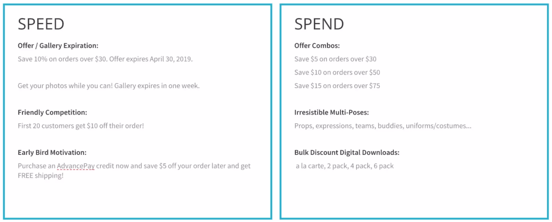 Offers + promotions are an important part of your online marketing strategy. Read on for ideas that will inspire a whole new way of connecting with your customers and getting them pumped about picture day. Before you create and advertise an offer, think about the end goal. Offers are used to incentivize your customers to spend more, sooner.