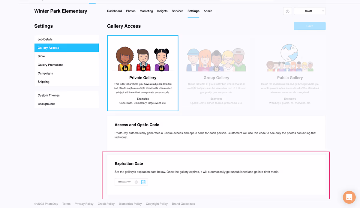 For private galleries, PhotoDay automatically generates a unique access and opt-in code for each person. Customers will use this code to see only the photos containing that individual. You can also set an expiration date for the gallery. Go back to the start of this section to read more about gallery statuses.