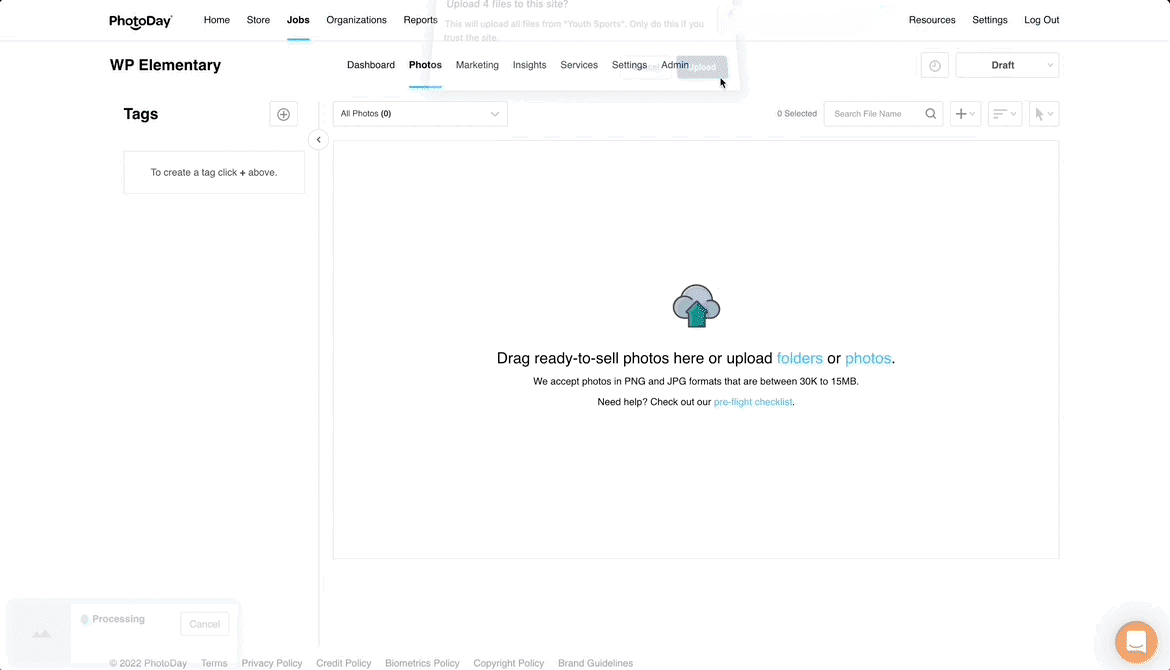 When your job is set up, picture day is over, and your post-processing is completed…it’s time to upload your photos! This section will walk you through uploading to Group and Public galleries. For Private, click here.