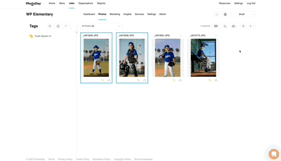 When you select one or more photos, a few more options will appear. Click the eye to view the selected photos. Click the tag to bulk tag the selected photos. Click the trash can to delete the selected photos.