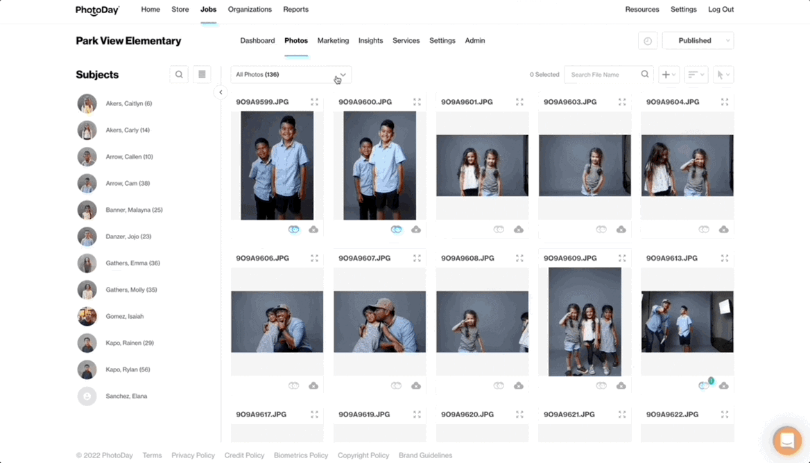 Contains Specific Word: Type a set of alpha/numeric characters you've used in the filename to specify each of your subject's featured photos and PhotoDay will automatically use those photos.